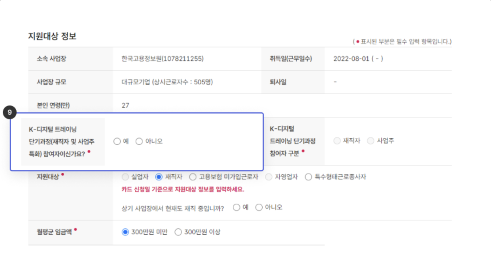 일부 재직자/사업주도 K-디지털 트레이닝 단기과정에는 참여 가능. 해당 여부를 선택합니다.