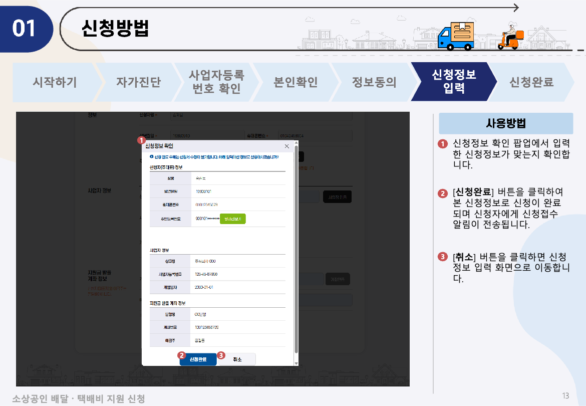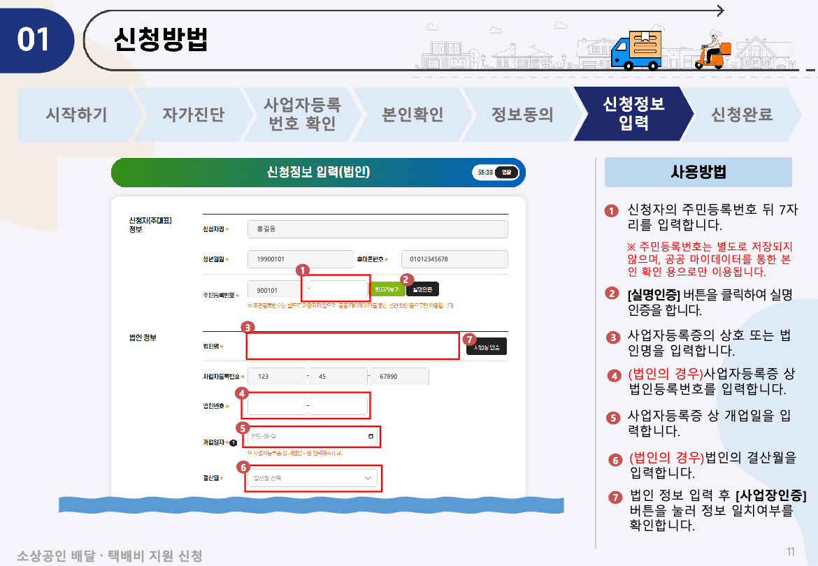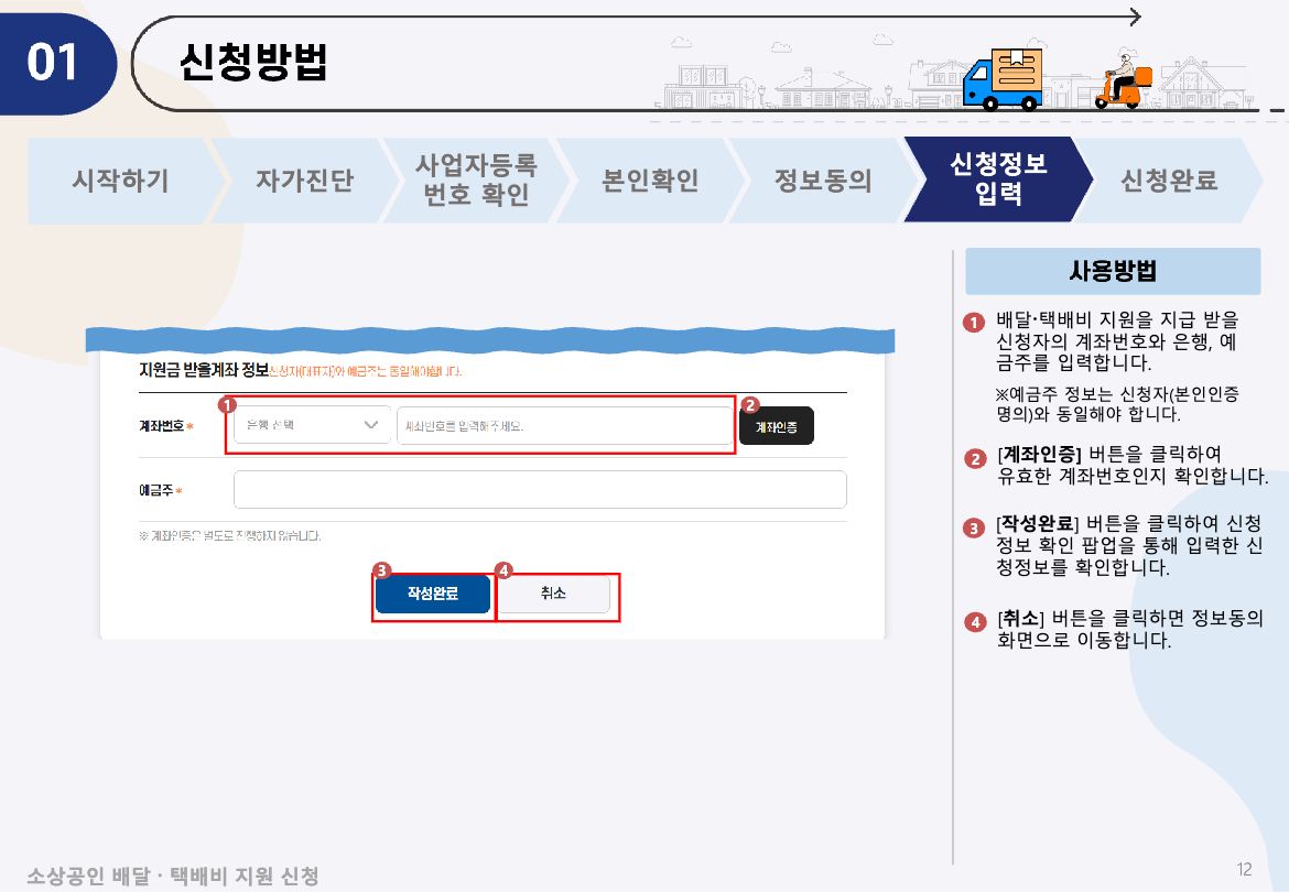 - 신청정보 입력: 대표자명, 계좌번호 등