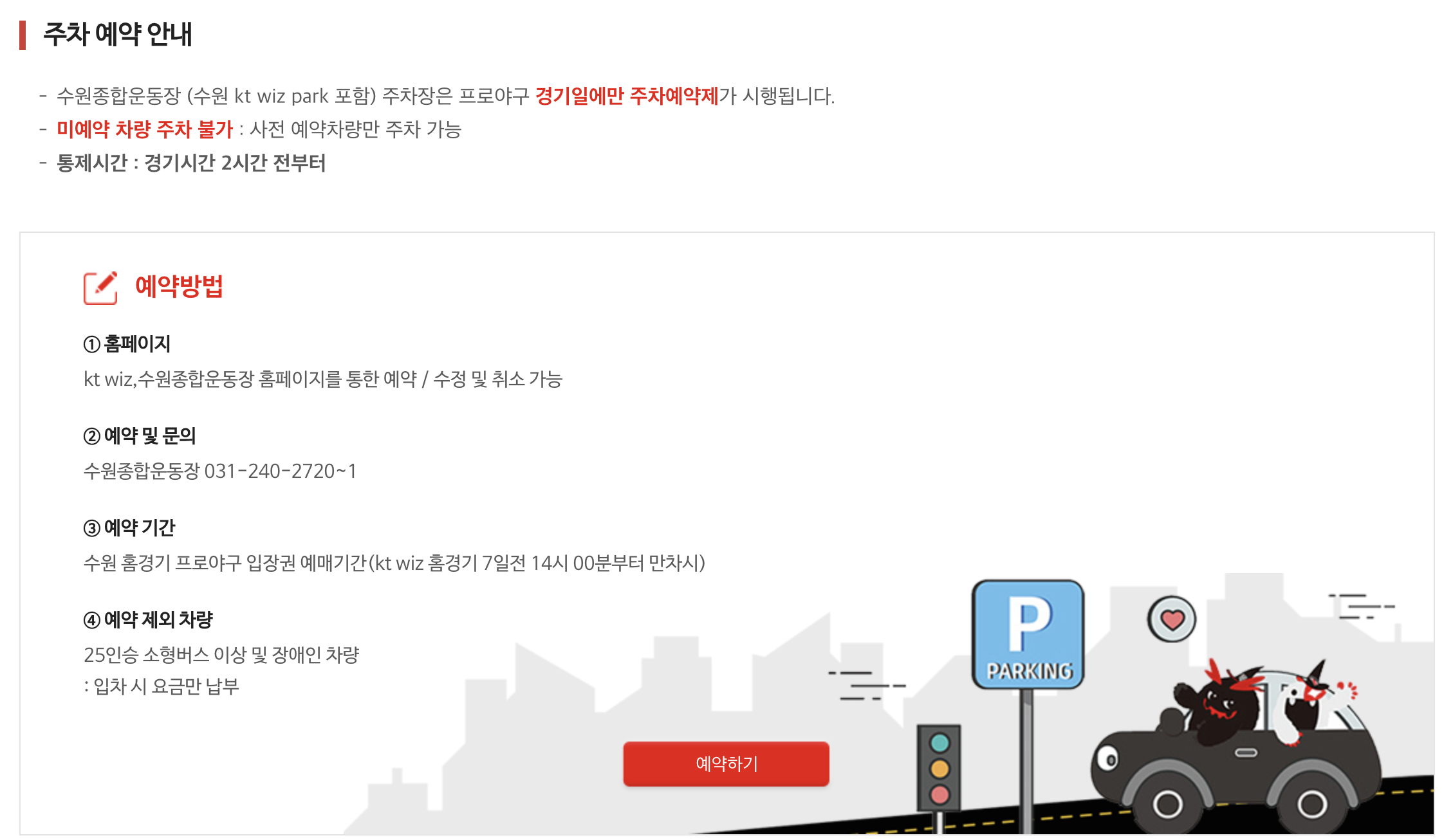 수원 종합운동장 내 kt위즈파크 주차장은 사전 예약제로만 운영되며, 예약 안 하면 입장 자체가 불가합니다.