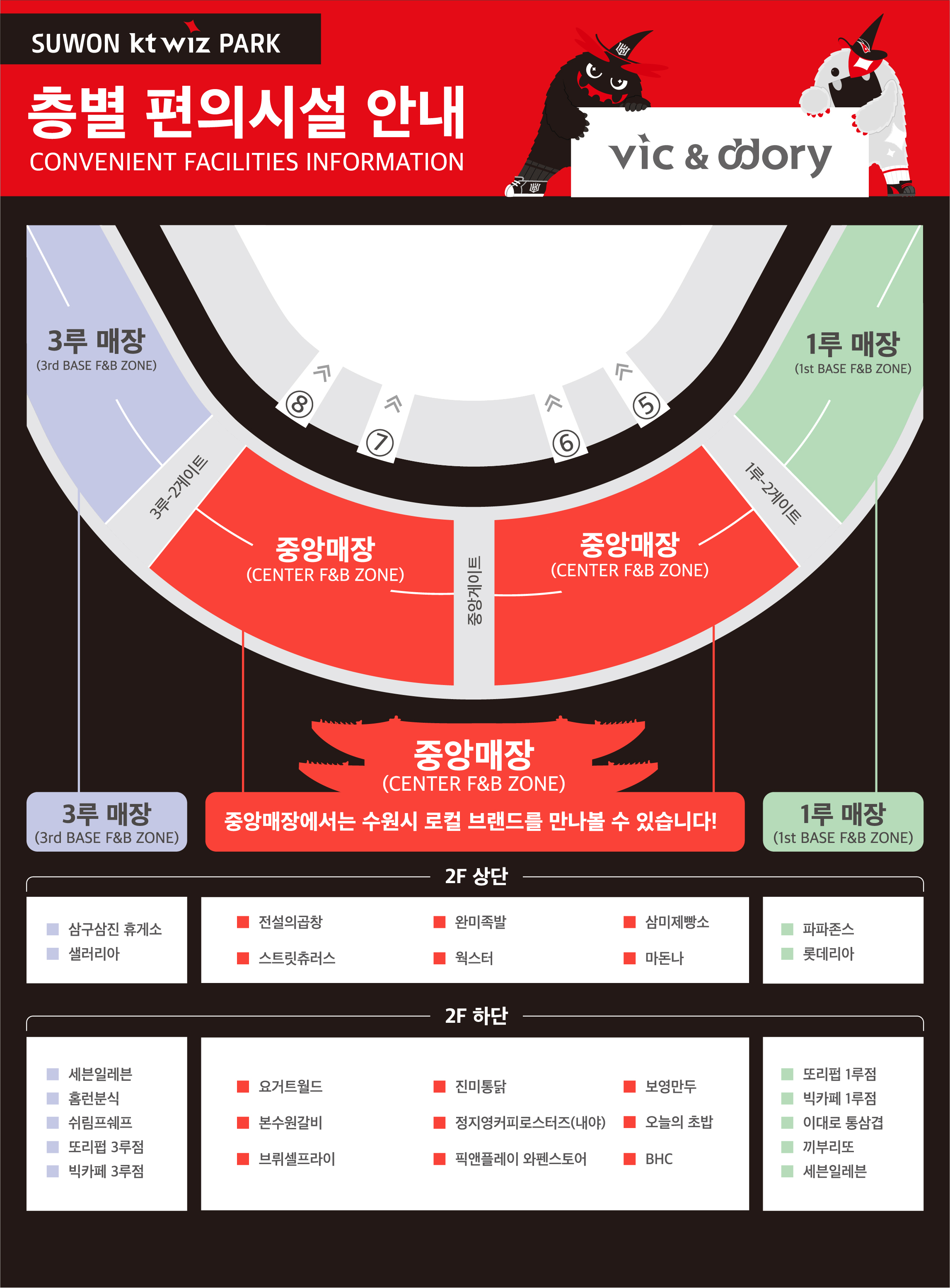 중앙매장과 1루·3루 매장에서는 수원 로컬 음식부터 전국 브랜드까지 다양하게 즐길 수 있습니다.