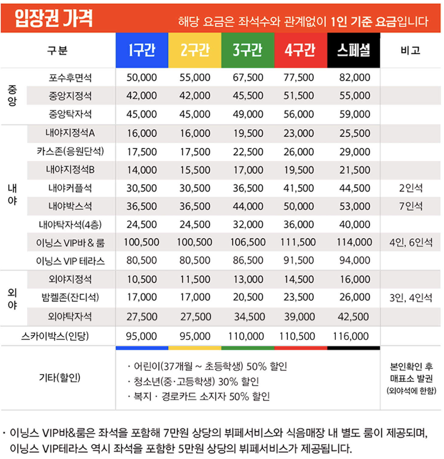좌석은 경기 요일과 팀에 따라 1~4구간으로 나뉘며, 구간별 가격은 다음과 같습니다.