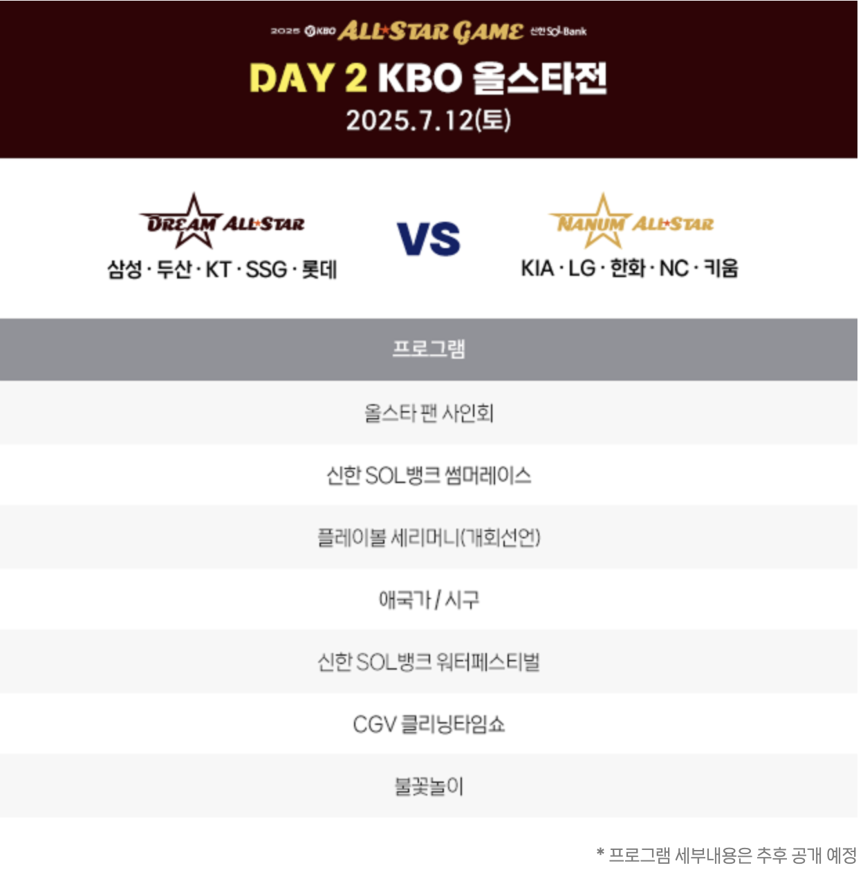 - 경기: 드림 올스타(삼성·두산·KT·SSG·롯데) vs 나눔 올스타(KIA·LG·한화·NC·키움)