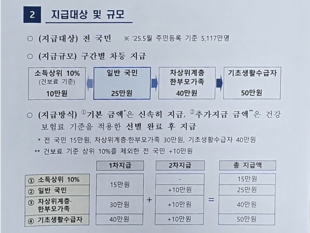 2025년 정부는 경기 활성화를 위해 전국민 대상의 민생회복 소비쿠폰 지원을 시행합니다. 소득수준에 따라 1차 지급 + 2차 추가지급으로 구성되며, 건강보험료 납부 기준에 따라 차등 혜택이 제공됩니다.