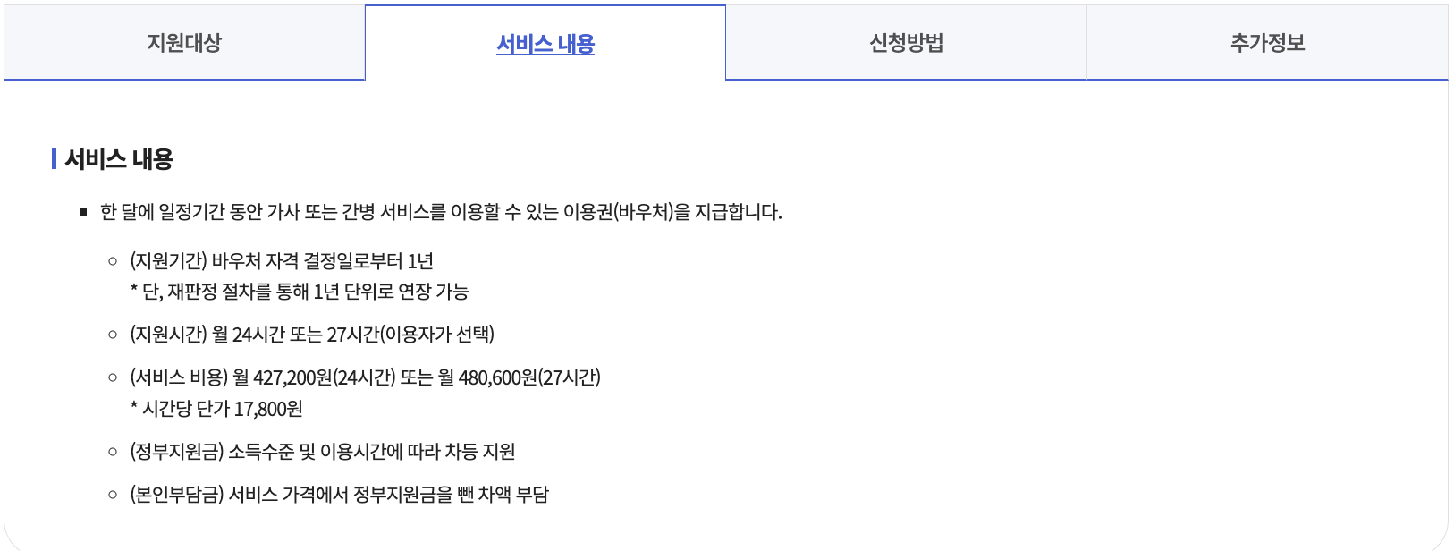 월 기준 24시간 또는 27시간의 방문서비스가 제공되며, 제공 시간에 따라 정부지원금 차등 적용 후 본인부담금만 납부하면 됩니다.