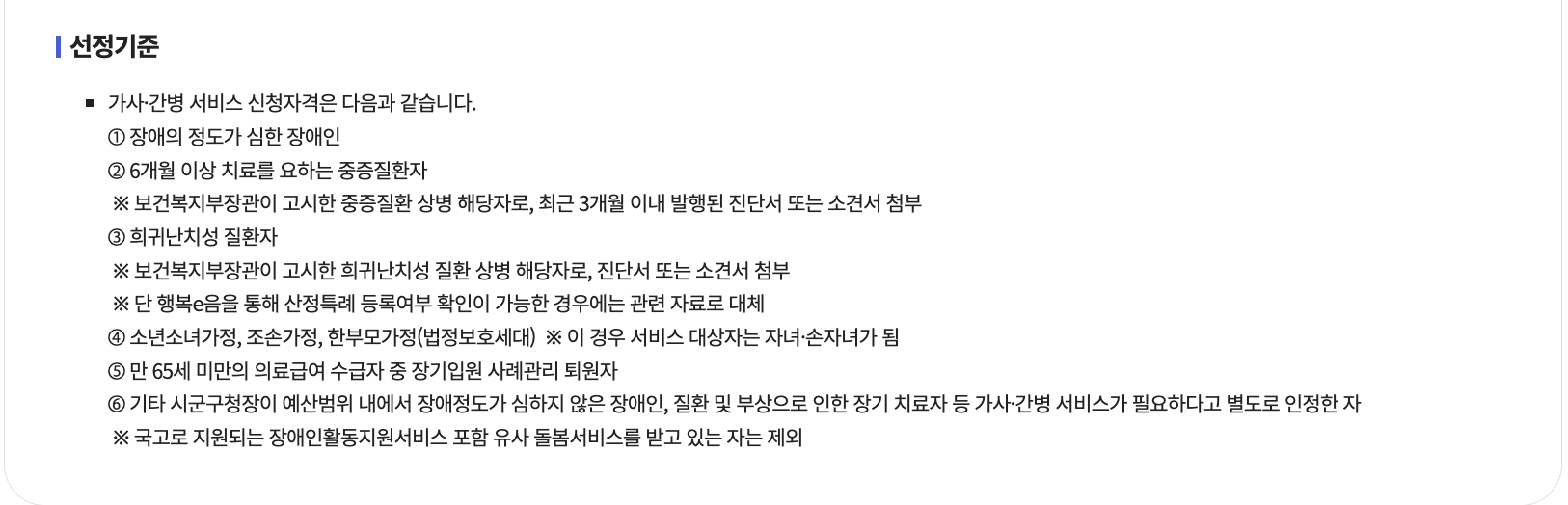 - 장애인활동지원·노인맞춤돌봄 등 유사서비스 이용자