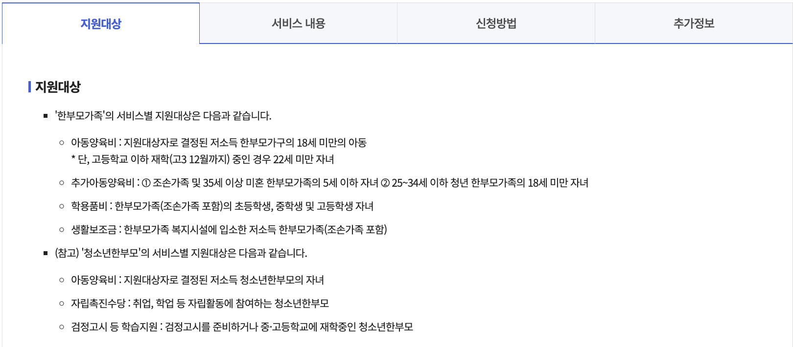 ② 추가아동양육비: 미혼모 포함 35세 이상 한부모의 5세 이하 자녀, 또는 25~34세 청년 한부모의 18세 미만 자녀
