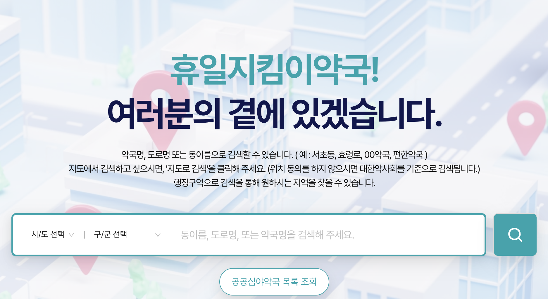 휴일지킴이약국은 보건복지부와 대한약사회가 운영하는 공식 약국 정보 서비스로, 공휴일 및 야간에 운영하는 약국을 실시간으로 확인할 수 있습니다.