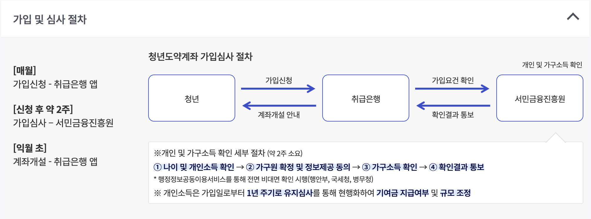 - 유지심사: 가입 1년 단위로 개인소득 재확인하여 정부기여금 재산정