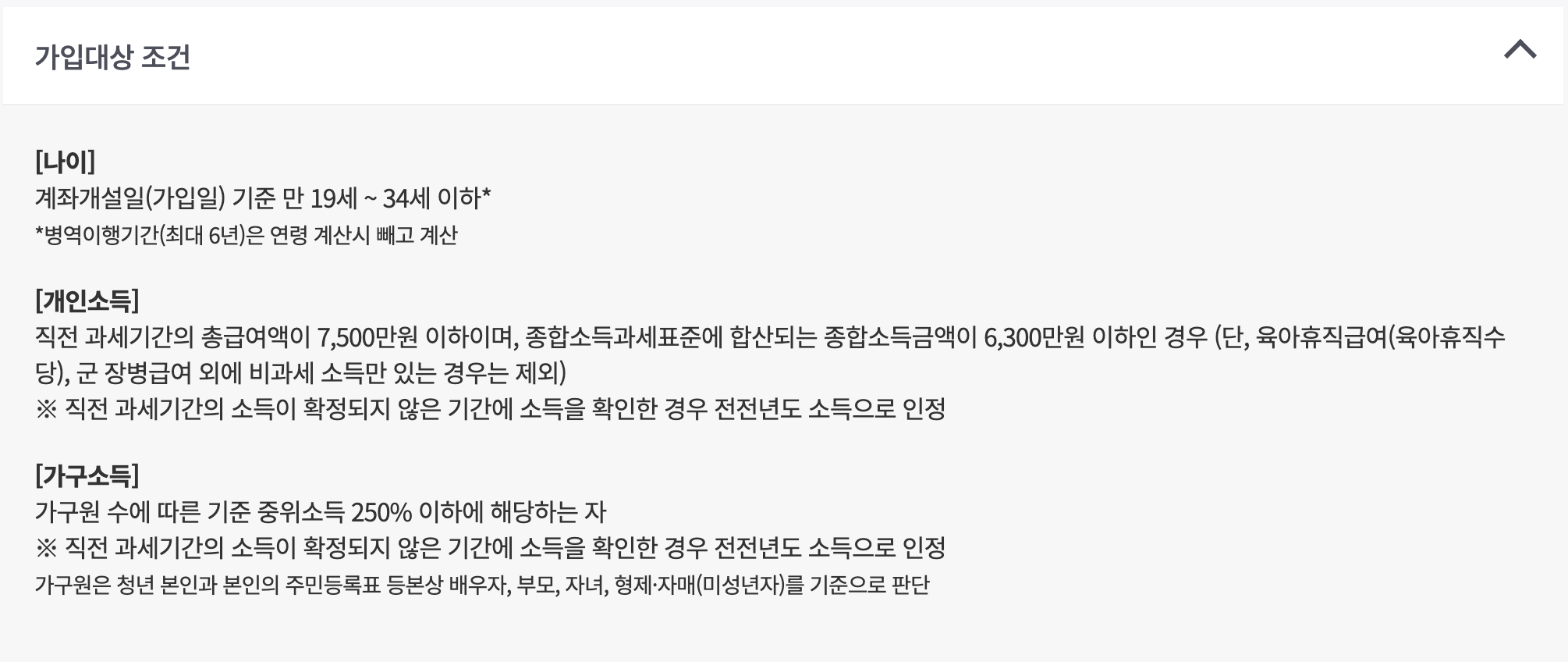 | 연령 | 만 19세 ~ 34세 이하 (병역이행기간 최대 6년 제외 가능) |