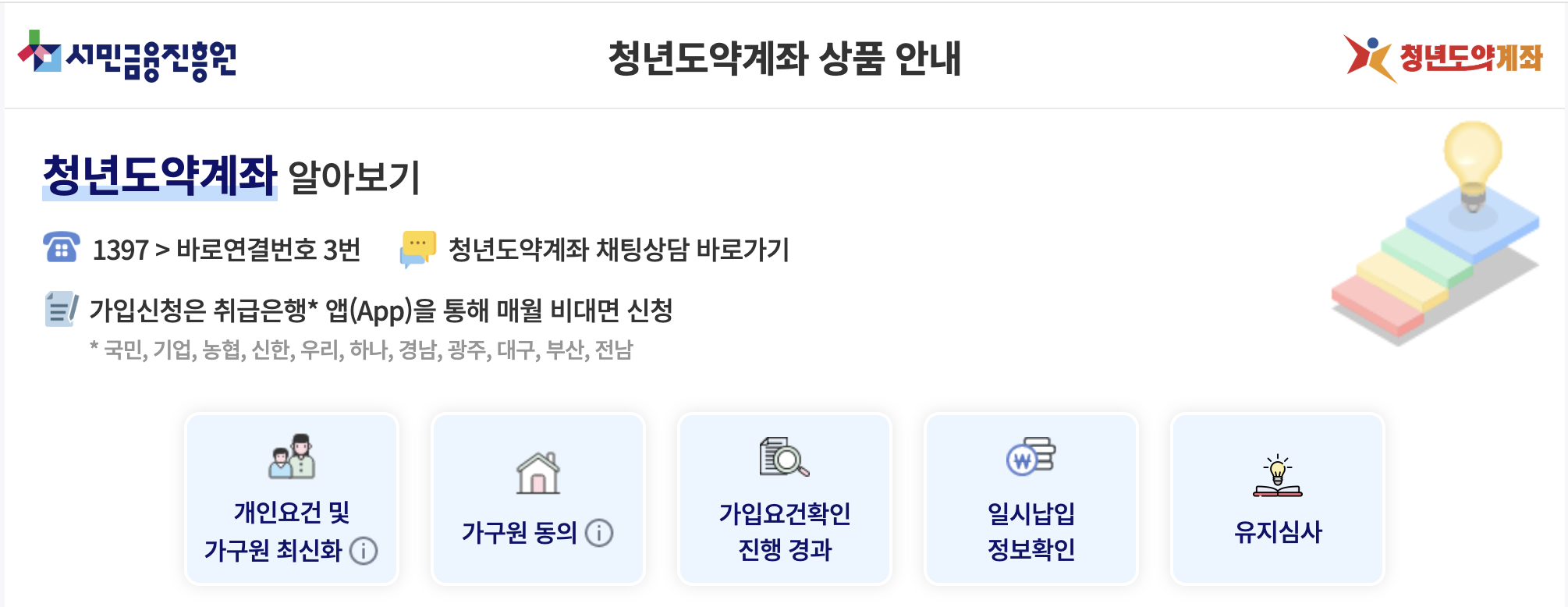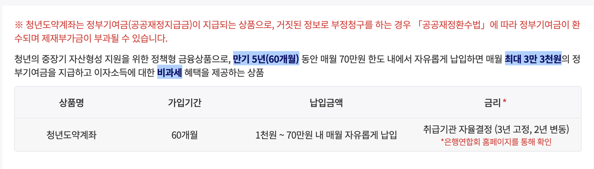 - 계좌 중복: 1인 1계좌 원칙 (청년희망적금 유지 중인 경우 가입 불가)