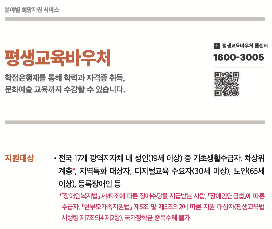 성인 누구나 학점은행제, 문화예술, 자격증 교육까지 수강 가능한 국가 지원 평생교육바우처가 다시 시작됩니다. 기초생활수급자, 차상위계층, 디지털 소외계층, 노인, 장애인 등은 우선 지원되며, 등록된 교육기관에서 바우처 카드로 사용할 수 있습니다.