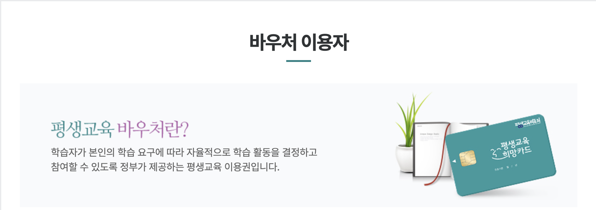 정부가 성인의 평생학습 참여 기회를 넓히기 위해 교육비를 바우처 카드로 지원하는 제도입니다. 선정된 이용자는 바우처 카드를 받아 등록 교육기관의 강좌를 수강할 수 있습니다.