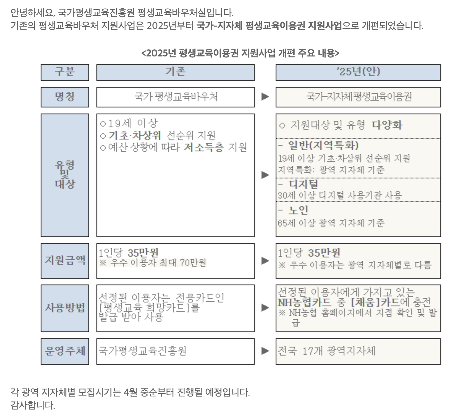 📢 2025년부터 평생교육바우처 제도가 '국가-지자체 평생교육이용권 지원사업'으로 전면 개편되었습니다.